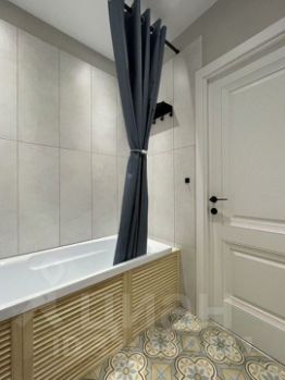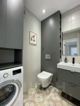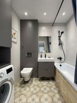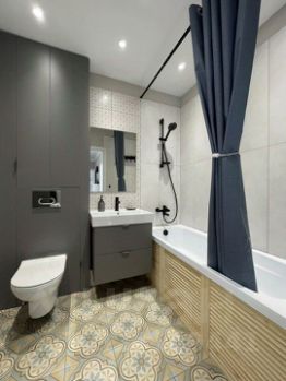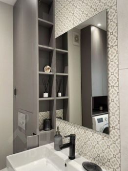 В с/у полная замена сантехники — инсталляция, акриловая ванна, трубы все спрятаны, мебель и хранение продумано до мелочей, вплоть до хранения длинной швабры.
