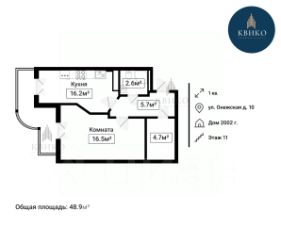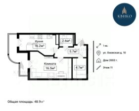 - общая площадь 48,9 м2, кухня 16,2 м2, просторные комнаты - 16,5 м2 и 12 м2, с/у - 2,6 м2, гардеробная - 4,7м2