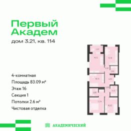 Продается 4-комнатная квартира площадью 83.09 кв.м. от девелопера "Академический" в жилом квартале "Первый Академ". Срок сдачи дома в 2028 году. Выгоды и скидка напрямую от застройщика.