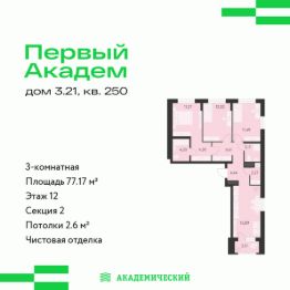 Продается 3-комнатная квартира площадью 77.17 кв.м. от девелопера "Академический" в жилом квартале "Первый Академ". Срок сдачи дома в 2028 году. Выгоды и скидка напрямую от застройщика.