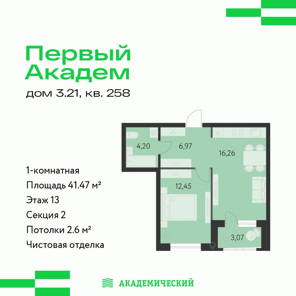 Продается 1-комнатная квартира площадью 41.47 кв.м. от девелопера "Академический" в жилом квартале "Первый Академ". Срок сдачи дома в 2028 году. Выгоды и скидка напрямую от застройщика. Дом расположен на въезде в район, отличается удобной транспортной развязкой. Рядом новая трамвайная линия и остановка общественного транспорта. Пять домов разной этажности. Эко-тренды во дворах. Холлы и фасады в стиле ар-деко. На территории квартала предусмотрено множество удобств для жильцов, включая видеонаблюдение 24/7, двор без машин, кладовые и подземный паркинг с выходом из лифта, коммерция на первых этажах.