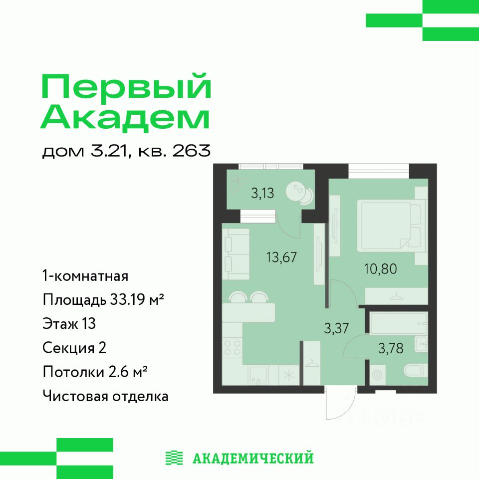 Продается 1-комнатная квартира площадью 33.19 кв.м. от девелопера "Академический" в жилом квартале "Первый Академ". Срок сдачи дома в 2028 году. Выгоды и скидка напрямую от застройщика.