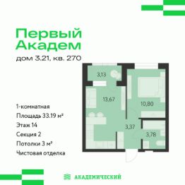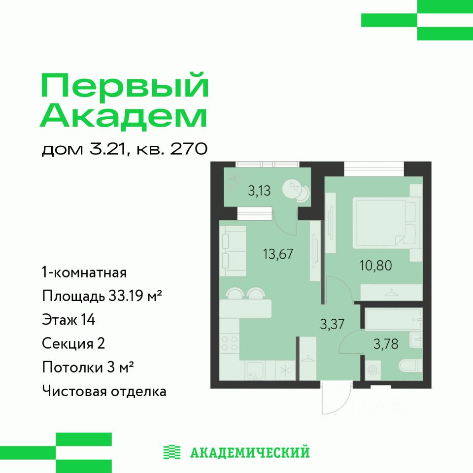 Продается 1-комнатная квартира площадью 33.19 кв.м. от девелопера "Академический" в жилом квартале "Первый Академ". Срок сдачи дома в 2028 году. Выгоды и скидка напрямую от застройщика.