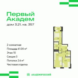 Продается 2-комнатная квартира площадью 61 кв.м. от девелопера "Академический" в жилом квартале "Первый Академ". Срок сдачи дома в 2028 году. Выгоды и скидка напрямую от застройщика.