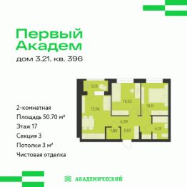 Продается 2-комнатная квартира площадью 50.7 кв.м. от девелопера "Академический" в жилом квартале "Первый Академ". Срок сдачи дома в 2028 году. Выгоды и скидка напрямую от застройщика.