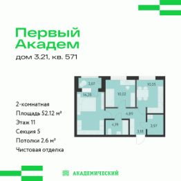 Продается 2-комнатная квартира площадью 52.12 кв.м. от девелопера "Академический" в жилом квартале "Первый Академ". Срок сдачи дома в 2028 году. Выгоды и скидка напрямую от застройщика.