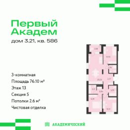 Продается 3-комнатная квартира площадью 76.1 кв.м. от девелопера "Академический" в жилом квартале "Первый Академ". Срок сдачи дома в 2028 году. Выгоды и скидка напрямую от застройщика.