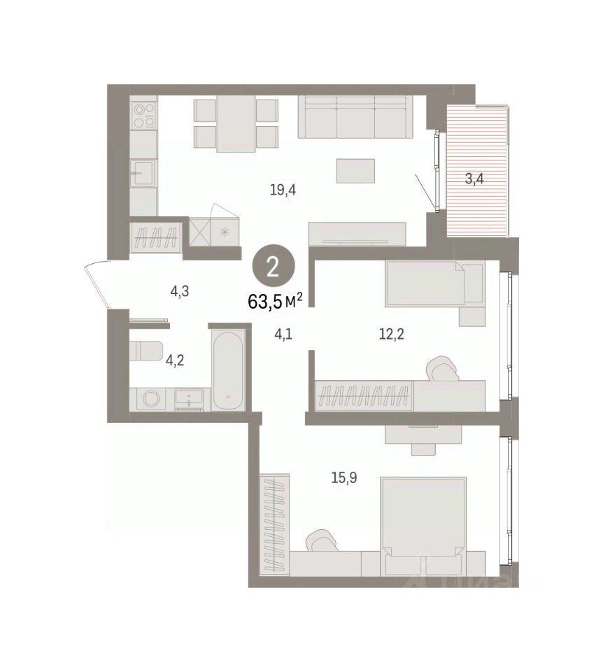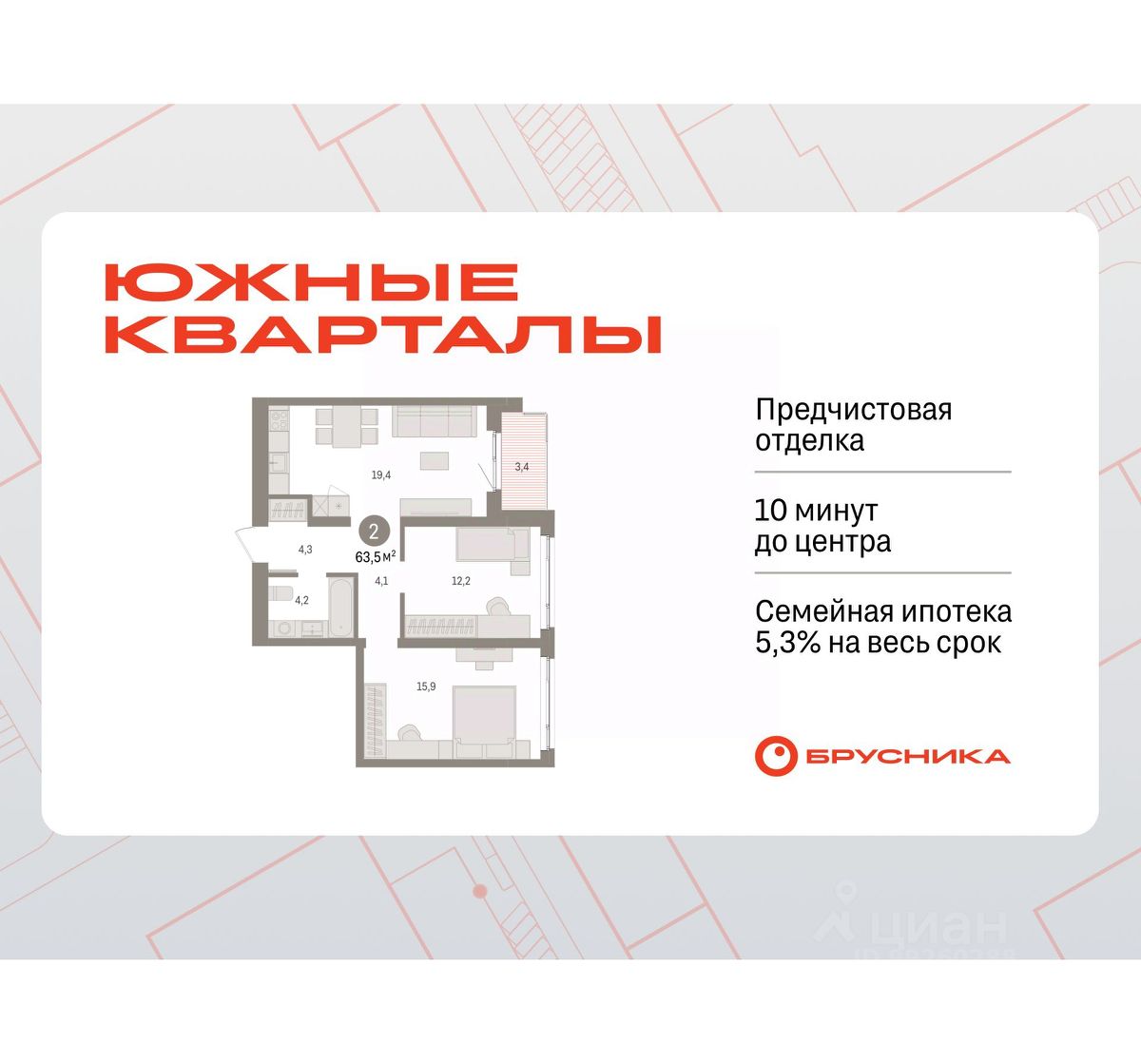 Квартира с кухней-гостиной и двумя спальнями в Южных кварталах. Особенности планировки: предчистовая отделка, балкон.