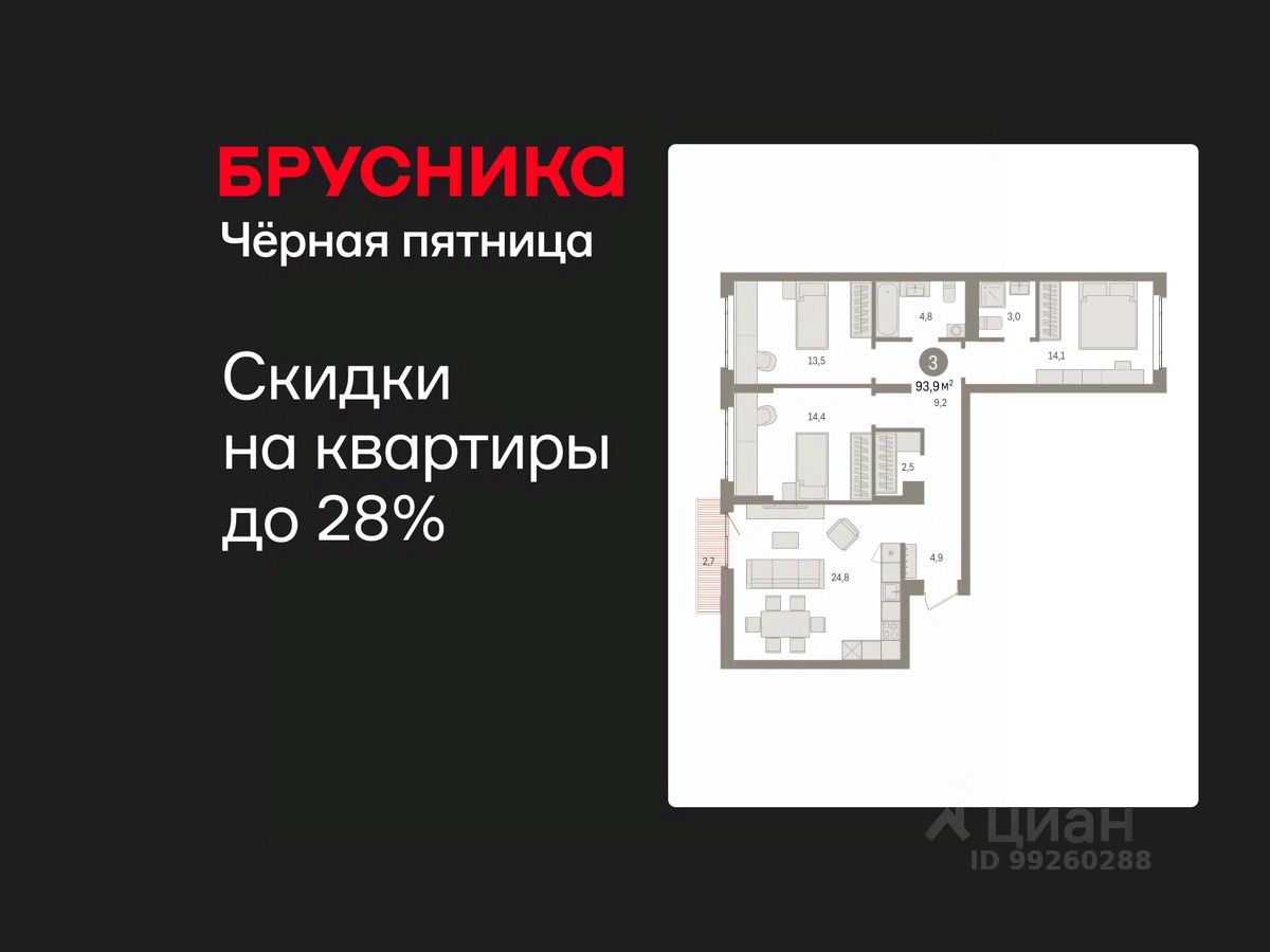 Просторная трехкомнатная квартира с предчистовой отделкой в ЖК "Квартал Траектория" на 4 этаже. Общая площадь: 93.9 кв.м., жилая: 42 кв.м., площадь просторной кухни-столовой: 24.8 кв.м. Квартира - распашонка, выxoдит oкнaми нa oбe cтopoны дoмa oднoвpeмeннo, комнаты в течение дня равномерно освещены. В квартире один балкон, два совмещенных санузла. Высота потолков 2.82 м.