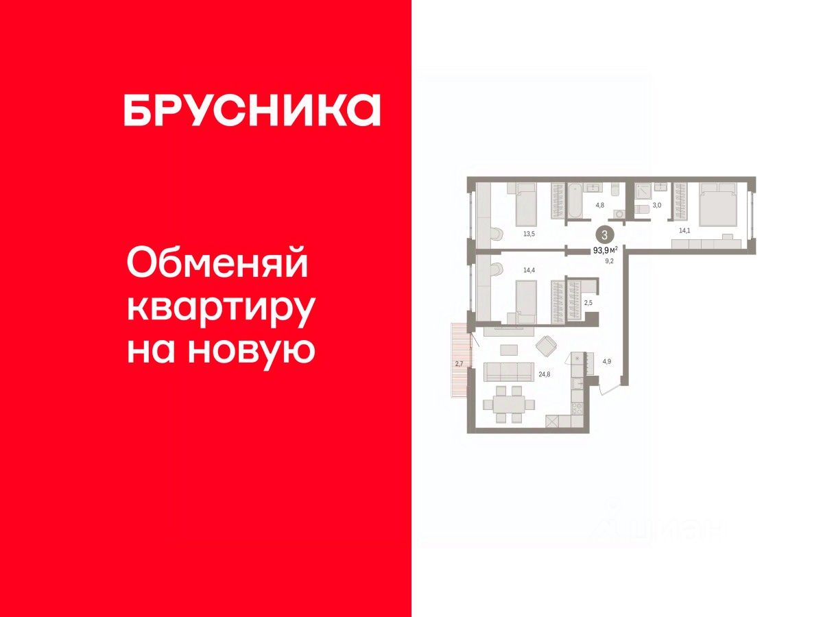 Продается 3-комн. квартира с предчистовой отделкой в ЖК "Квартал Траектория" на 4 этаже. Общая площадь: 93.9 кв.м., жилая: 42 кв.м., площадь просторной кухни-столовой: 24.8 кв.м. Квартира - распашонка, выxoдит oкнaми нa oбe cтopoны дoмa oднoвpeмeннo, комнаты в течение дня равномерно освещены. В квартире один балкон, два совмещенных санузла. Высота потолков 2.82 м.