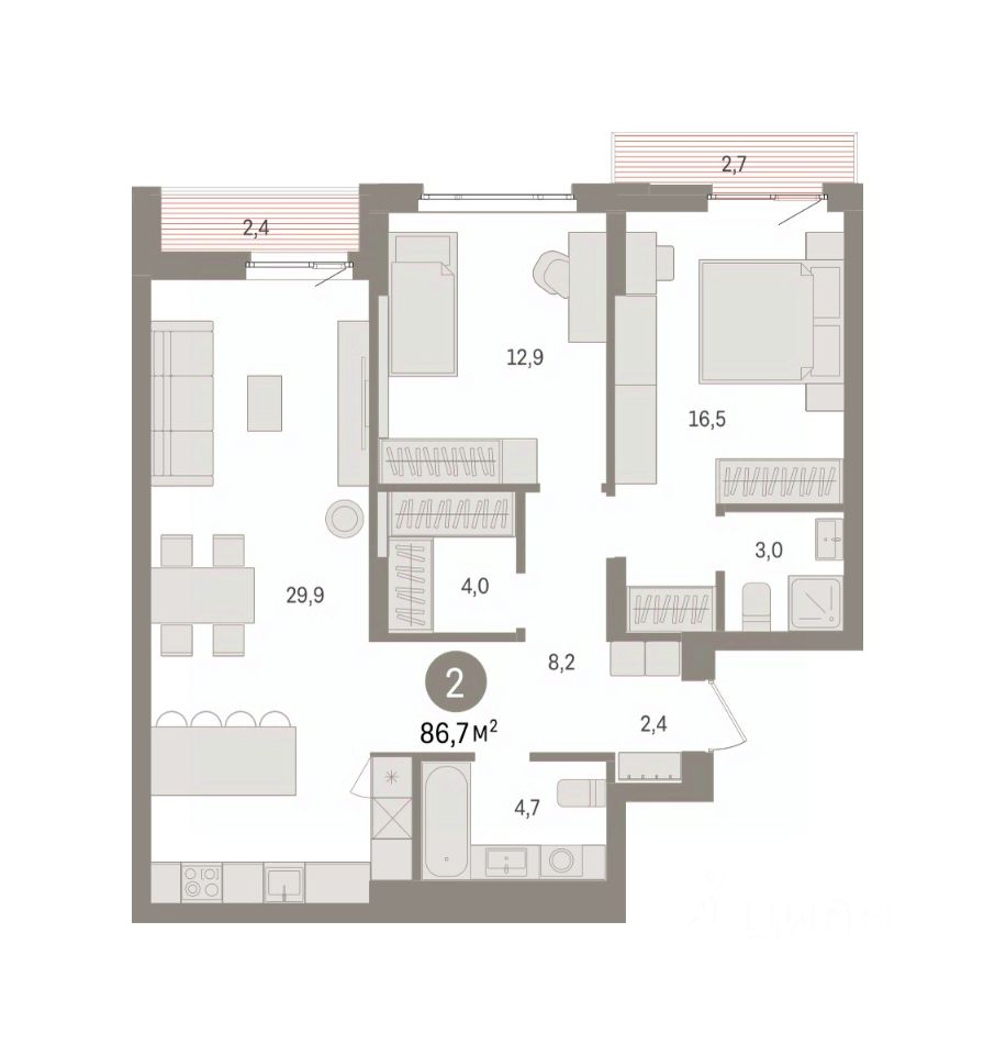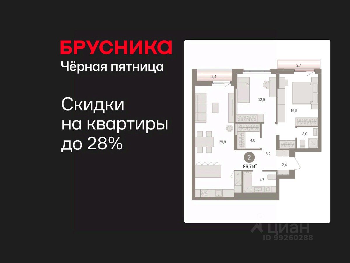 Продается двухкомнатная квартира с предчистовой отделкой в ЖК "Квартал Траектория" на 6 этаже. Общая площадь: 86.7 кв.м., жилая: 29.4 кв.м., площадь просторной кухни-столовой: 29.9 кв.м. Комнаты изолированные, все окна выходят на одну сторону. В квартире один балкон и одна лоджия, два совмещенных санузла. Высота потолков 2.82 м.