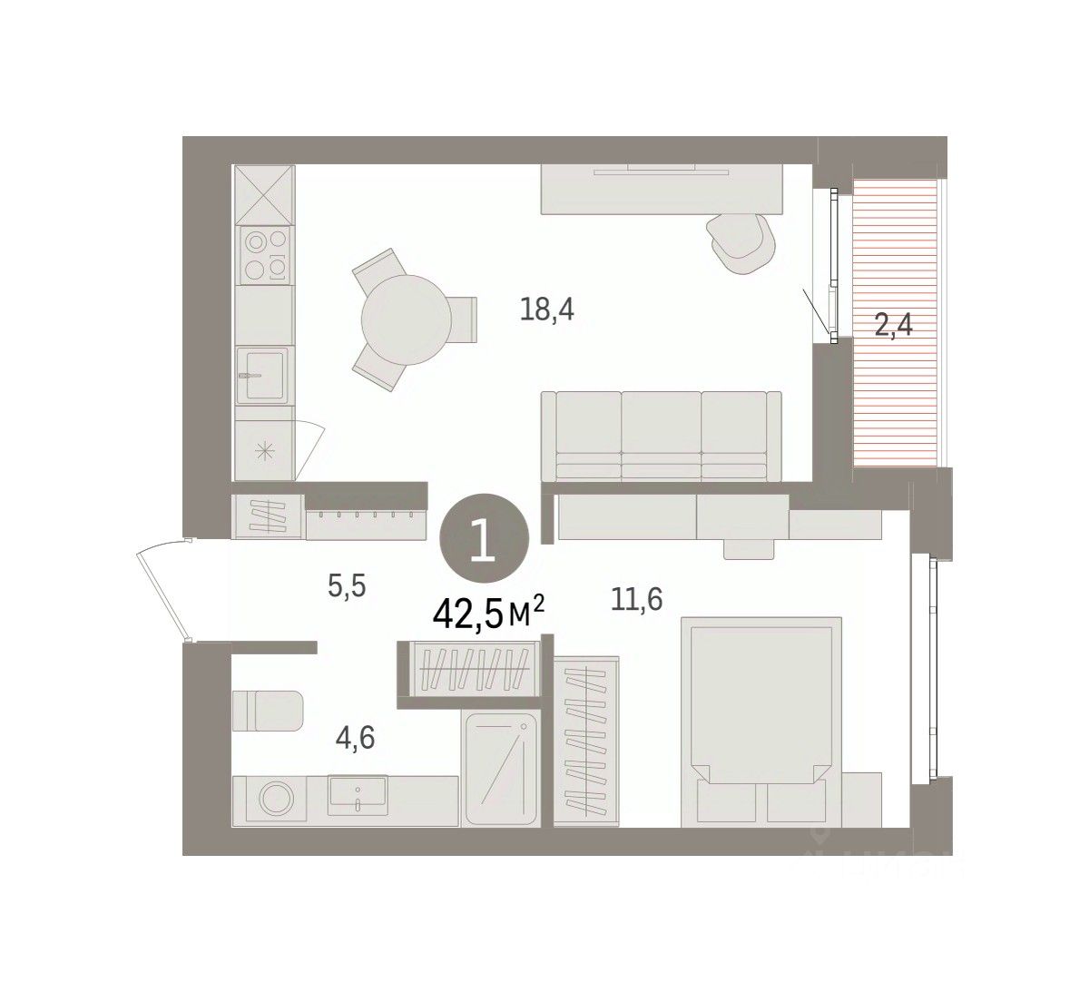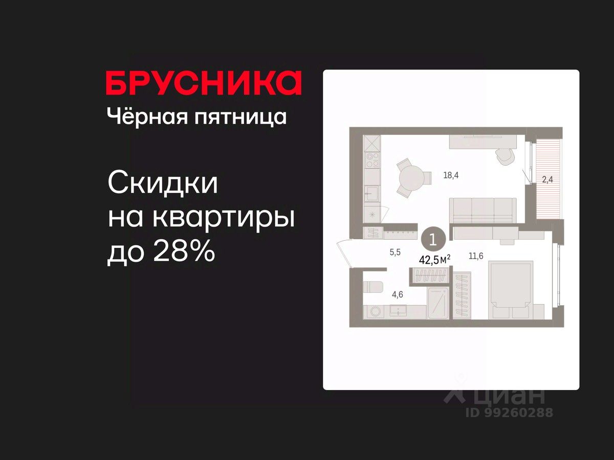 1-комн. квартира от застройщика с предчистовой отделкой в ЖК "Квартал Траектория" на 9 этаже. Общая площадь: 42.5 кв.м., жилая: 11.3 кв.м., площадь просторной кухни-столовой: 17.6 кв.м. Все окна выходят на одну сторону. В квартире одна лоджия, один совмещенный санузел. Высота потолков 2.82 м.