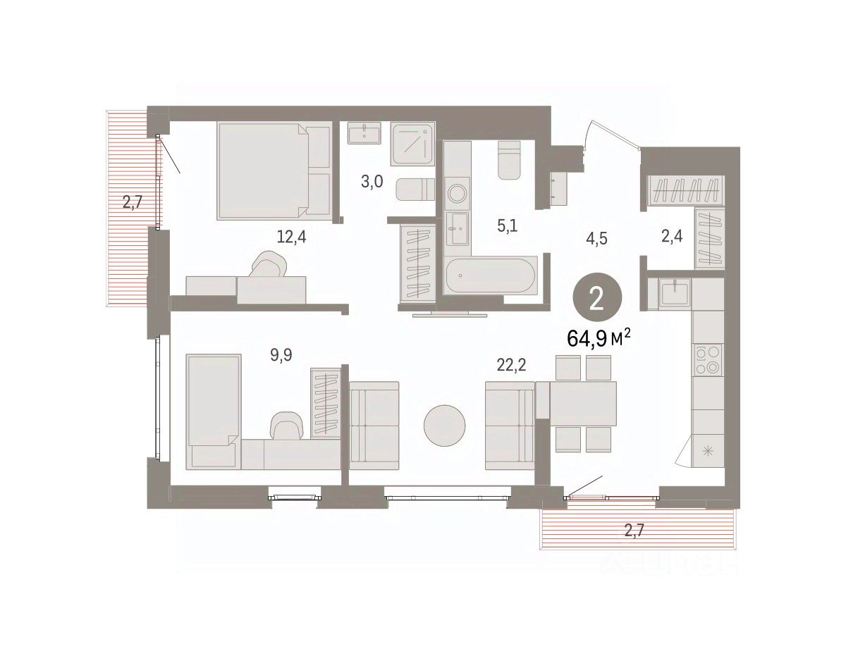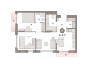 Просторная 2-комн. квартира с предчистовой отделкой в ЖК "Квартал Траектория" на 7 этаже. Общая площадь: 64.9 кв.м., жилая: 22.3 кв.м., площадь просторной кухни-столовой: 22.2 кв.м. Квартира угловая, идеально подойдет любителям тишины и панорамных видов. В квартире два балкона, два совмещенных санузла. Высота потолков 2.82 м.