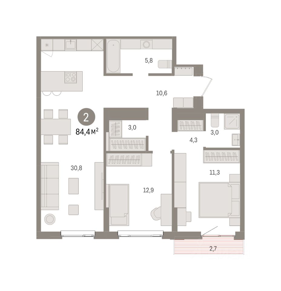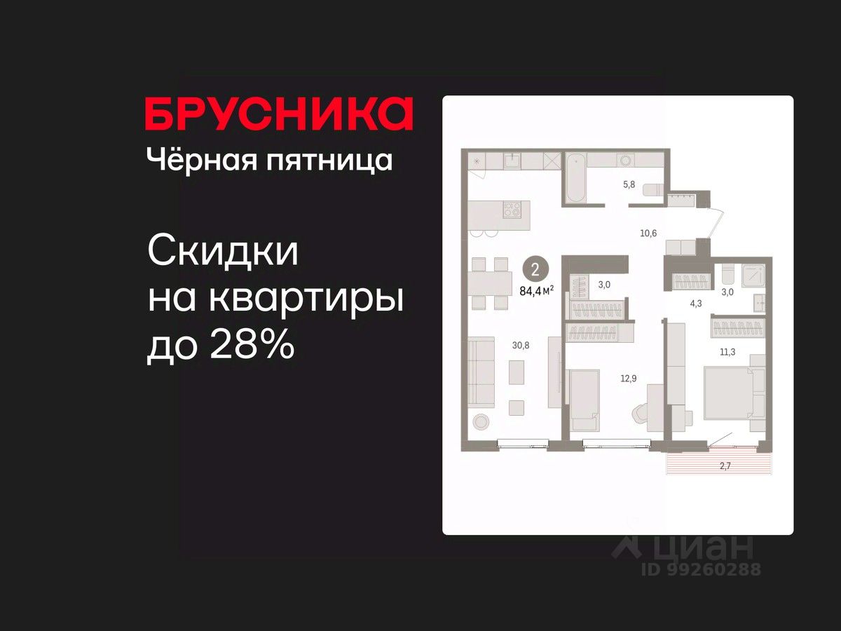 2-комн. квартира с предчистовой отделкой в ЖК "Квартал Траектория" на 6 этаже. Общая площадь: 84.4 кв.м., жилая: 24.2 кв.м., площадь просторной кухни-столовой: 30.8 кв.м. Комнаты изолированные, все окна выходят на одну сторону. В квартире один балкон, два совмещенных санузла. Высота потолков 2.82 м.