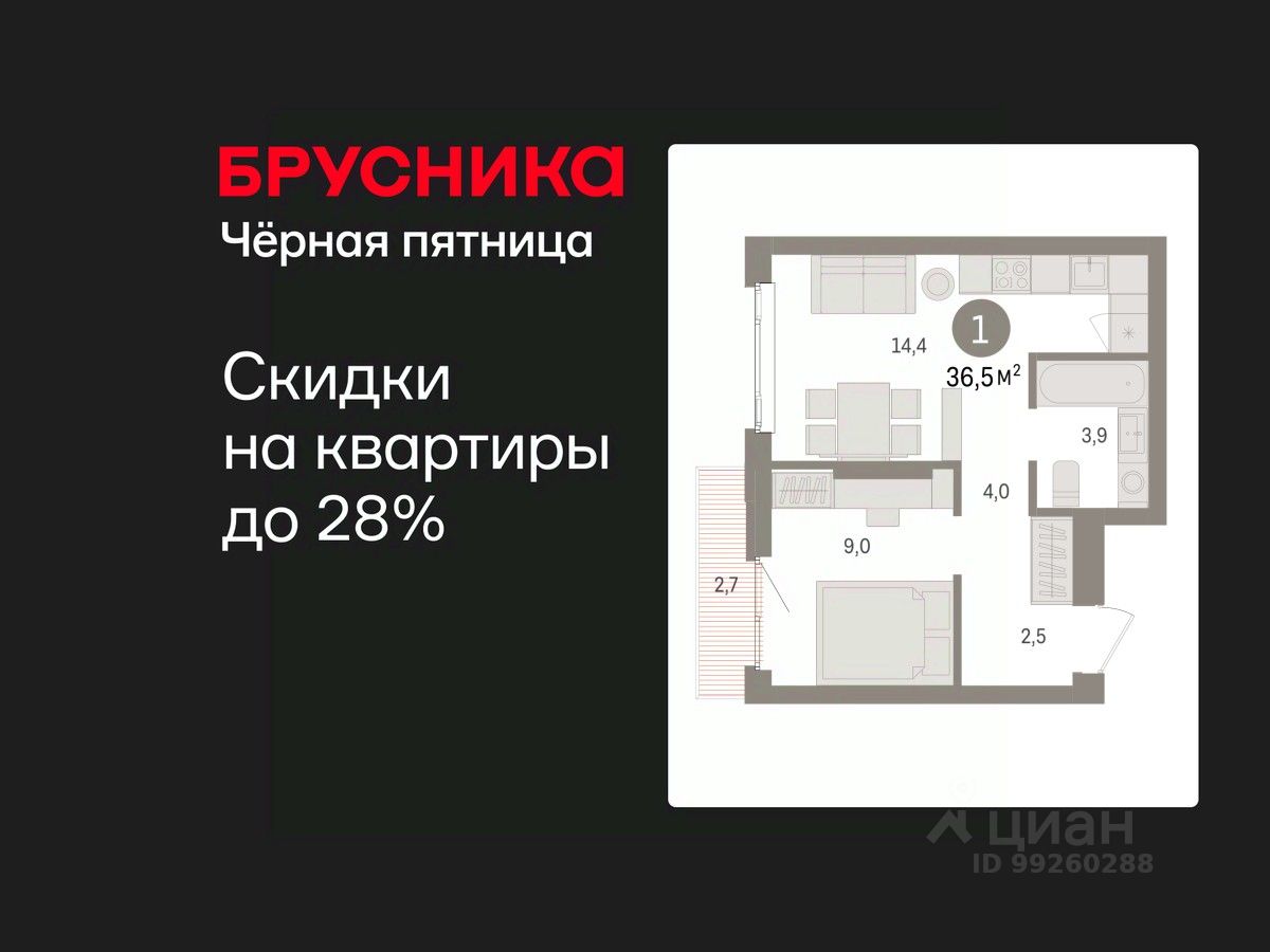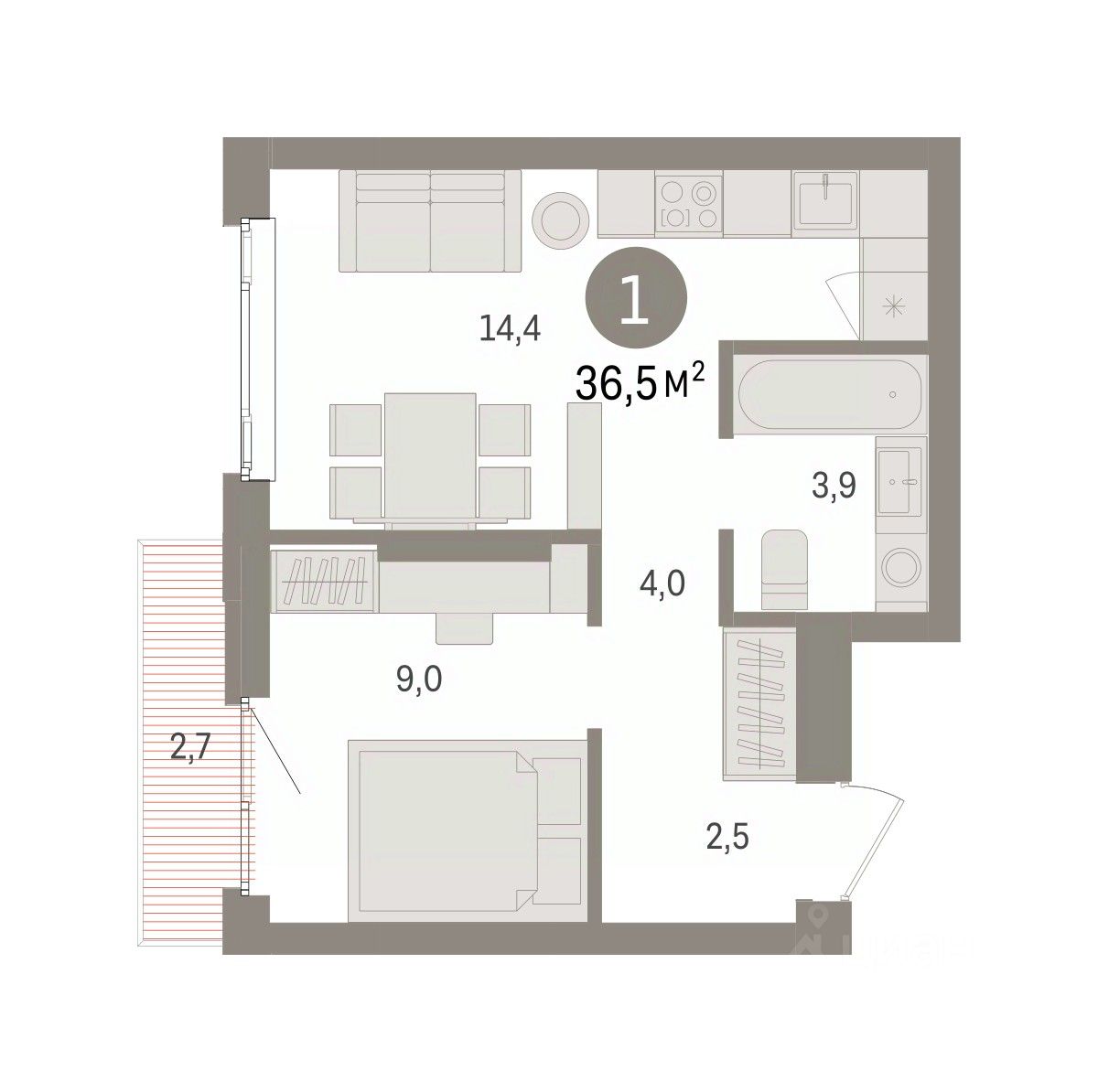1-комн. квартира с предчистовой отделкой в ЖК "Квартал Траектория" на 7 этаже. Общая площадь: 36.5 кв.м., жилая: 9 кв.м., площадь просторной кухни-столовой: 14.4 кв.м. Все окна выходят на одну сторону. В квартире один балкон, один совмещенный санузел. Высота потолков 2.82 м.