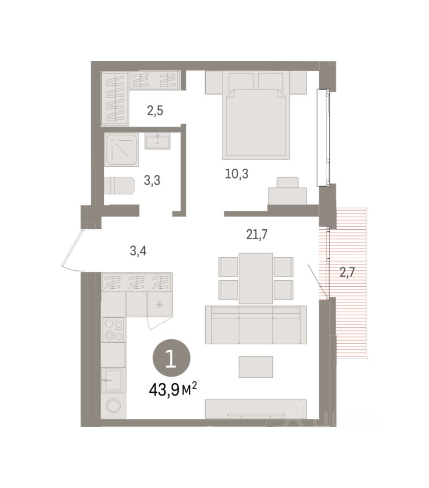 Просторная однокомнатная квартира с предчистовой отделкой в ЖК "Квартал Траектория" на 5 этаже. Общая площадь: 43.9 кв.м., жилая: 10.3 кв.м., площадь просторной кухни-столовой: 21.7 кв.м. Все окна выходят на одну сторону. В квартире один балкон, один совмещенный санузел. Высота потолков 2.82 м.
