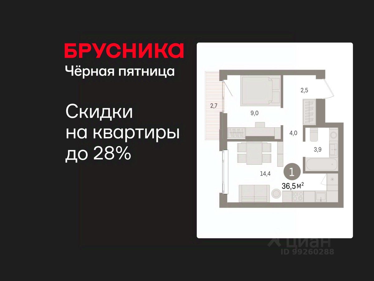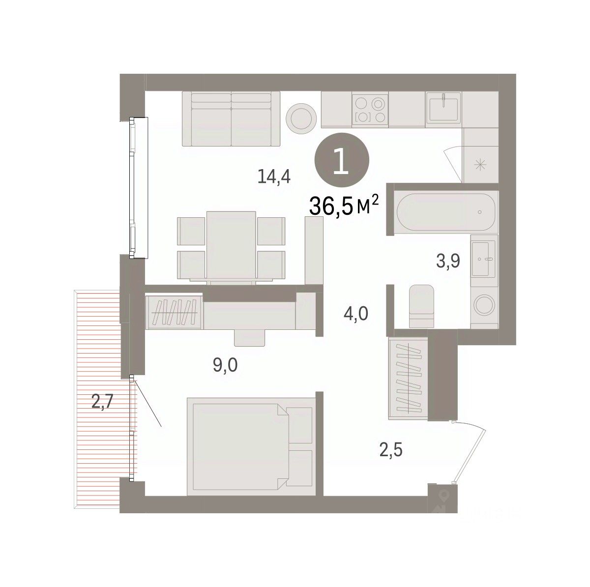 1-комн. квартира от застройщика с предчистовой отделкой в ЖК "Квартал Траектория" на 7 этаже. Общая площадь: 36.5 кв.м., жилая: 9 кв.м., площадь просторной кухни-столовой: 14.4 кв.м. Все окна выходят на одну сторону. В квартире один балкон, один совмещенный санузел. Высота потолков 2.82 м.