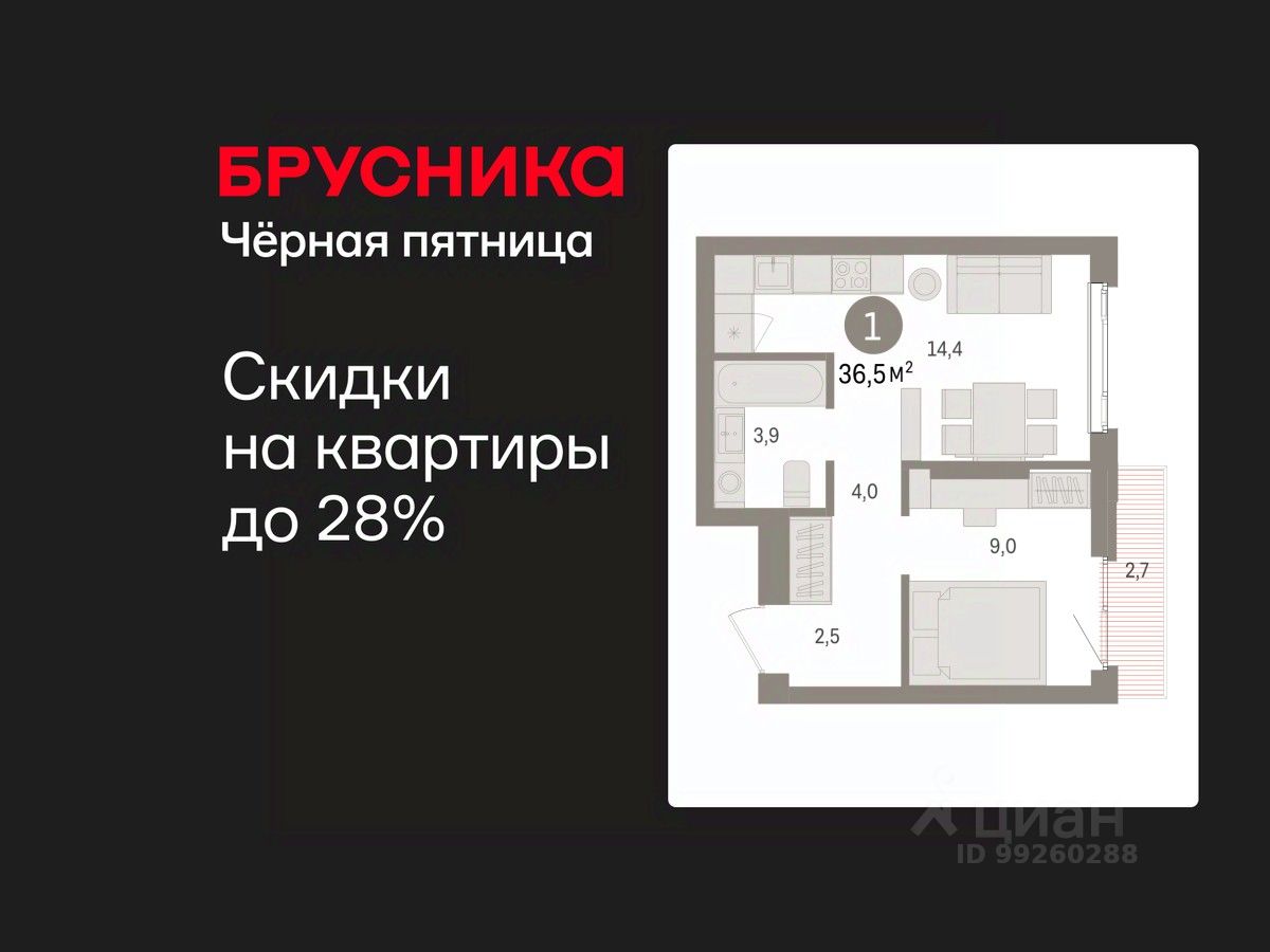 Квартира с кухней-гостиной и одной спальней в квартале "Траектория". Особенности планировки: стартовая цена, предчистовая отделка, балкон.