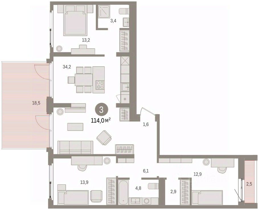 Квартира с кухней-гостиной и тремя спальнями в квартале "Траектория". Особенности планировки: гардеробная, окна в пол, вид во двор, панорамное остекление, лоджия, разнесённые спальни, предчистовая отделка, мастер-спальня, терраса.