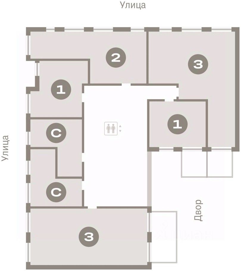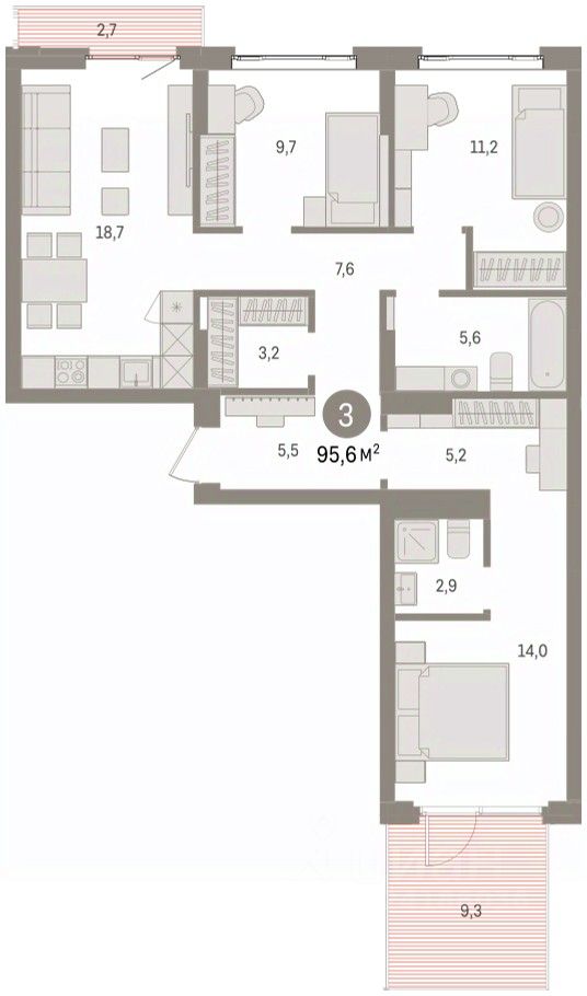 Квартира с кухней-гостиной и тремя спальнями в квартале "Траектория". Особенности планировки: гардеробная, вид во двор, разнесённые спальни, предчистовая отделка, мастер-спальня, терраса, балкон.