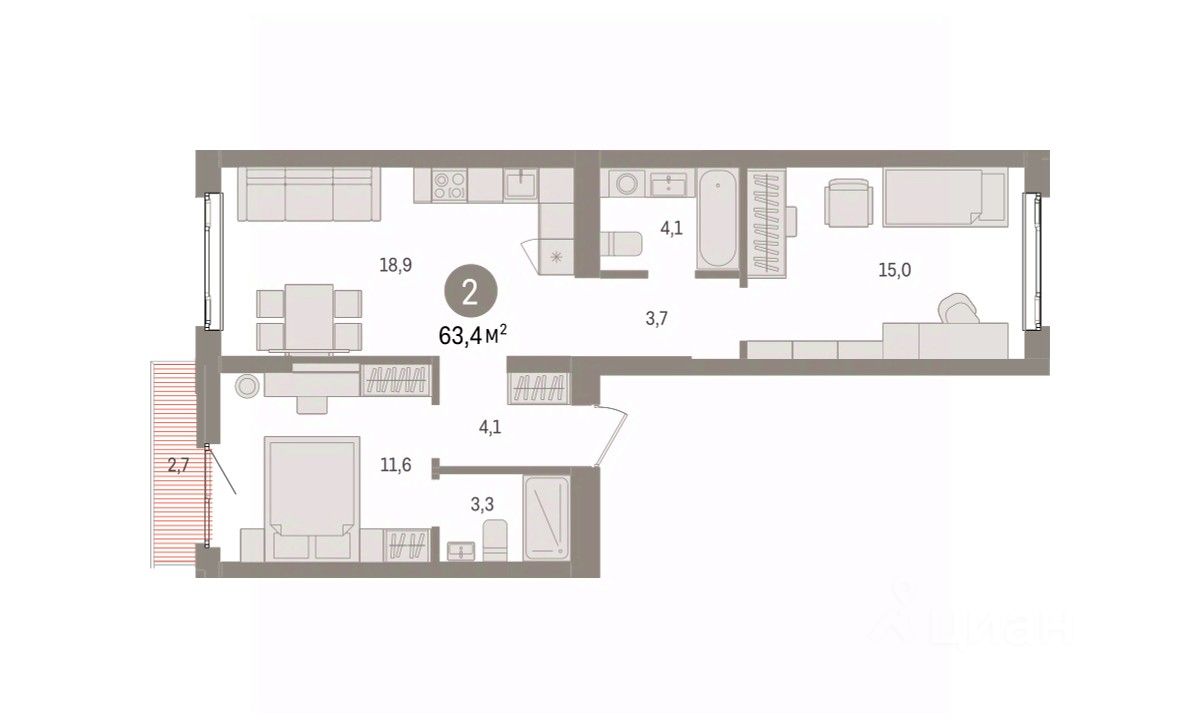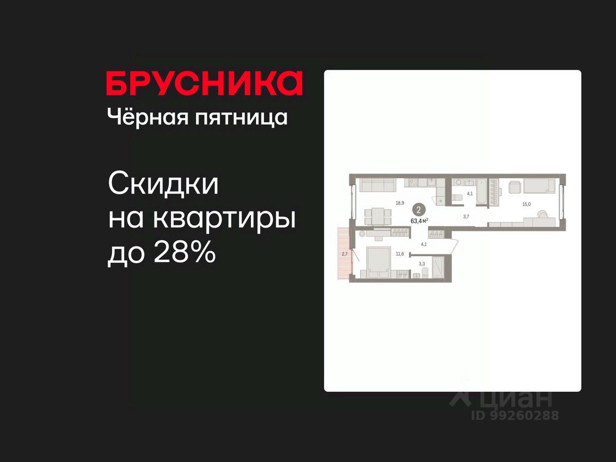 Просторная 2-комн. квартира с предчистовой отделкой в ЖК "Квартал Траектория" на 4 этаже. Общая площадь: 63.4 кв.м., жилая: 26.6 кв.м., площадь просторной кухни-столовой: 18.9 кв.м. Квартира - распашонка, без проходных комнат, окна выходят на paзные стороны дома. В квартире один балкон, два совмещенных санузла. Высота потолков 2.82 м.