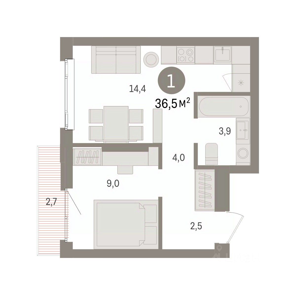 Квартира с кухней-гостиной и одной спальней в квартале "Траектория". Особенности планировки: предчистовая отделка, балкон.