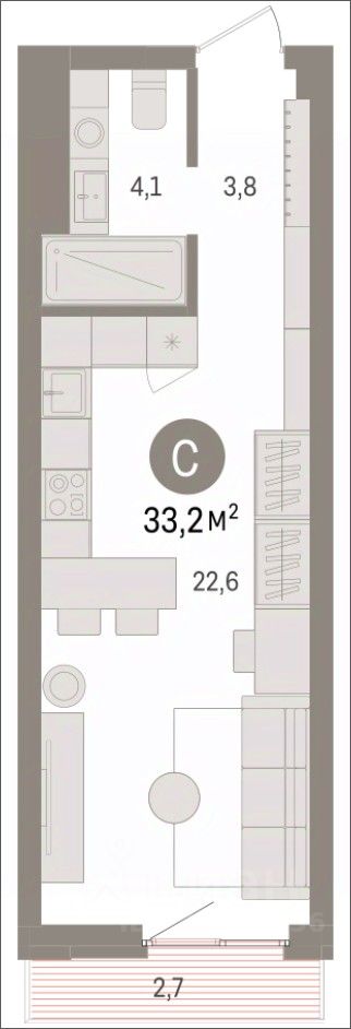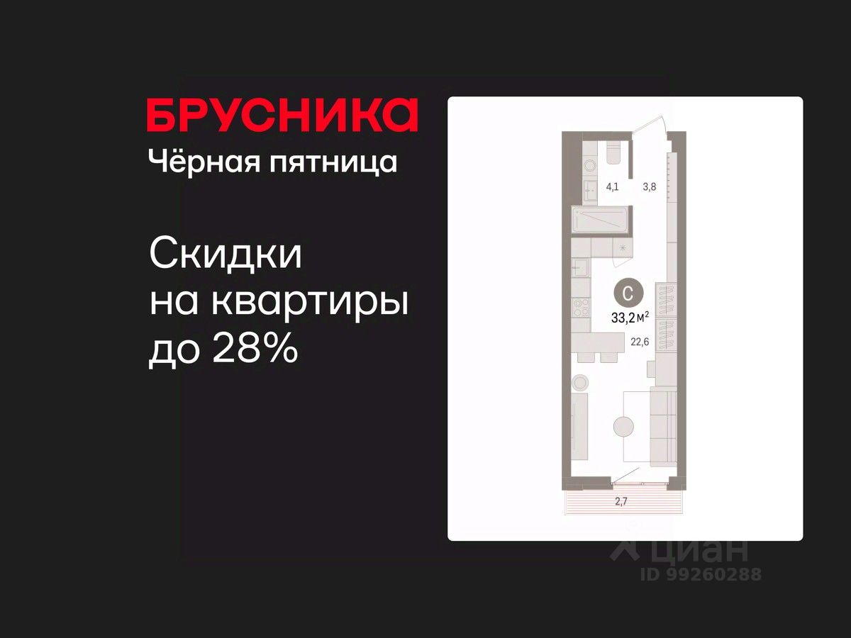 Однокомнатная студия с предчистовой отделкой в ЖК "Квартал Траектория" на 12 этаже. Общая площадь: 33.2 кв.м. Высота потолков 2.82 м.
