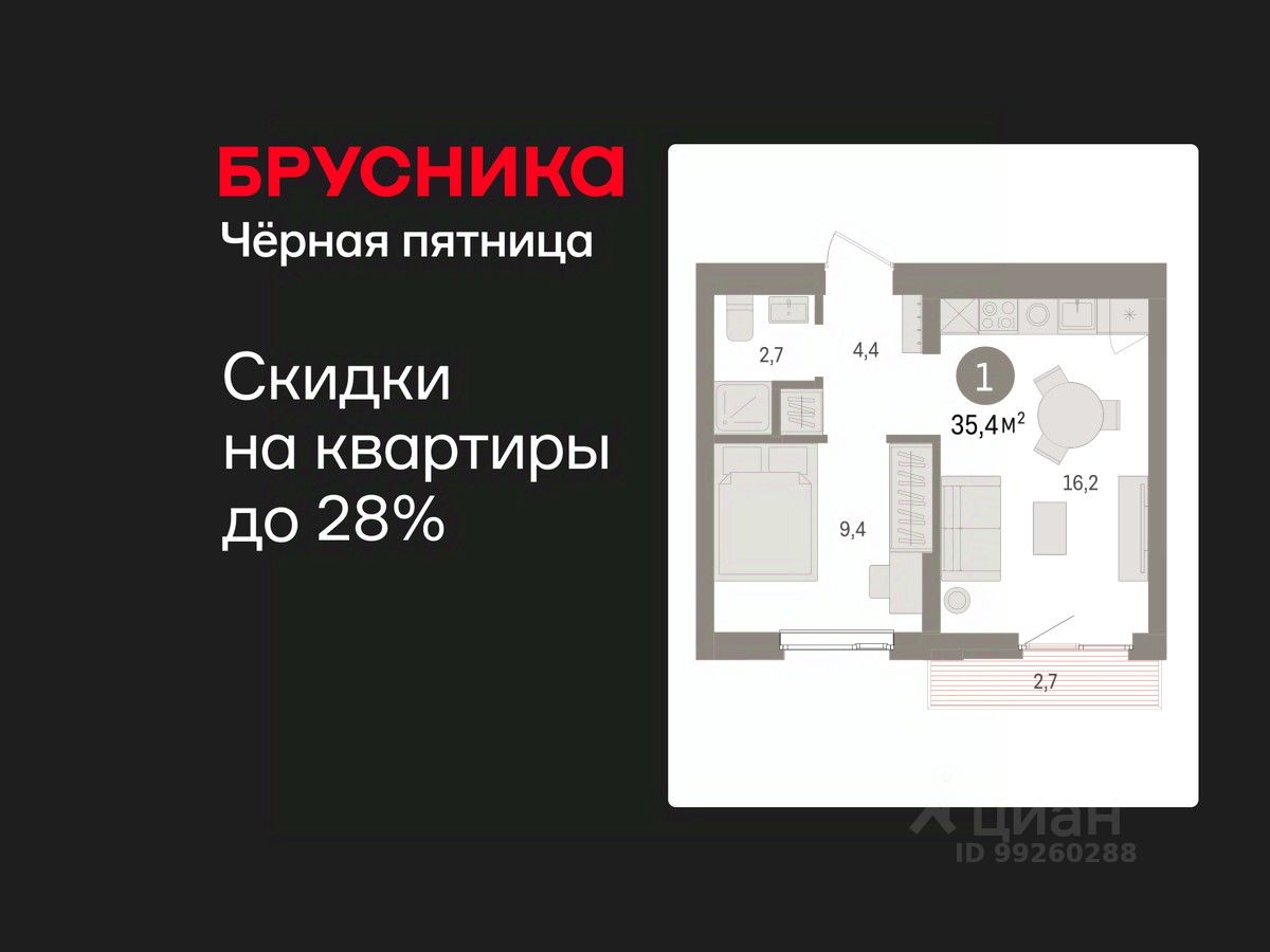 Квартира с кухней-гостиной и одной спальней в квартале "Траектория". Особенности планировки: вид во двор, предчистовая отделка, балкон.