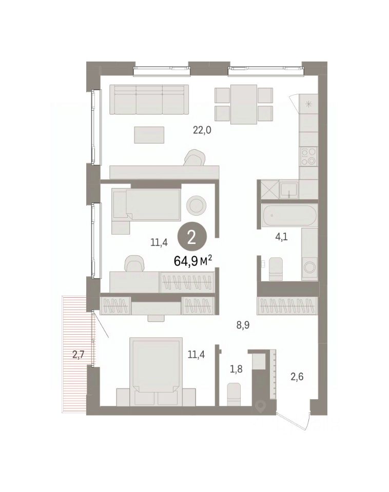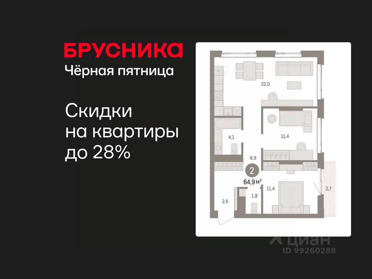 Просторная 2-комн. квартира с предчистовой отделкой в ЖК "Квартал Траектория" на 11 этаже. Общая площадь: 64.9 кв.м., жилая: 22.3 кв.м., площадь просторной кухни-столовой: 22.2 кв.м. Угловая квартира, идеально подойдет любителям тишины и панорамных видов. В квартире два балкона, два совмещенных санузла. Высота потолков 2.82 м.