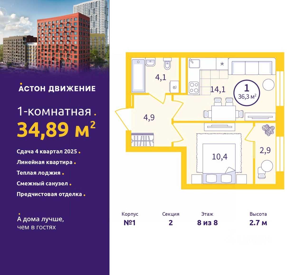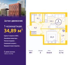 Продается однокомнатная квартира с предчистовой отделкой в ЖК "Астон.Движение" на 8 этаже. Общая площадь: 34.89 кв.м., жилая: 10.4 кв.м., площадь просторной кухни-столовой: 14.1 кв.м. Все окна выходят на одну сторону. В квартире одна лоджия, один совмещенный санузел. Высота потолков 2.7 м.