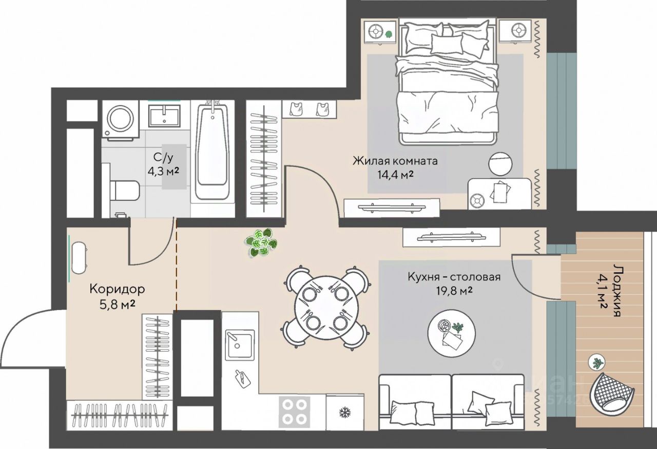 Продаётся 1-комнатная квартира в строящемся доме (Дом 1 этап 1.1), срок сдачи: I-кв. 2028, общей площадью 46.4 кв.м., на 10 этаже.