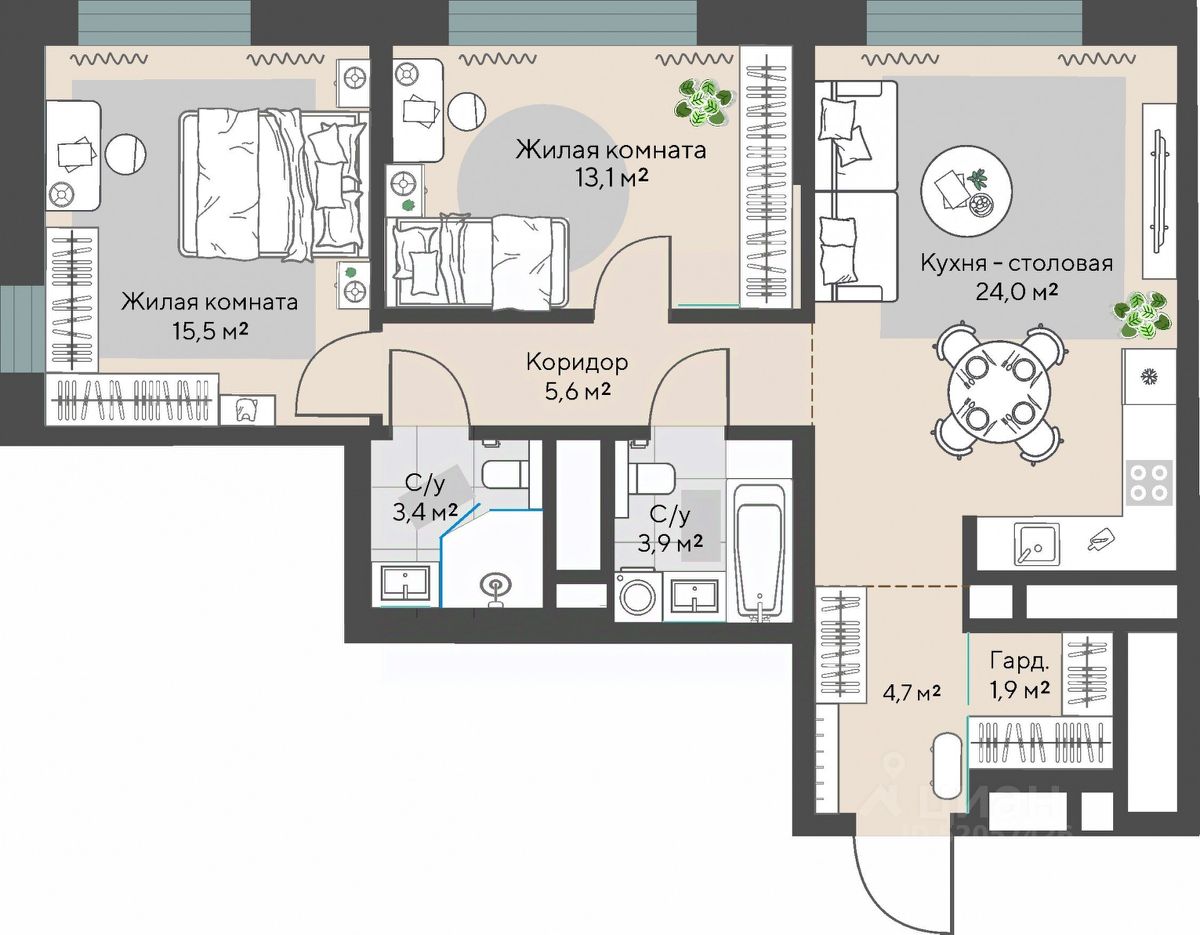Продаётся 2-комнатная квартира в строящемся доме (Дом 1 этап 1.1), срок сдачи: I-кв. 2028, общей площадью 72.1 кв.м., на 10 этаже.