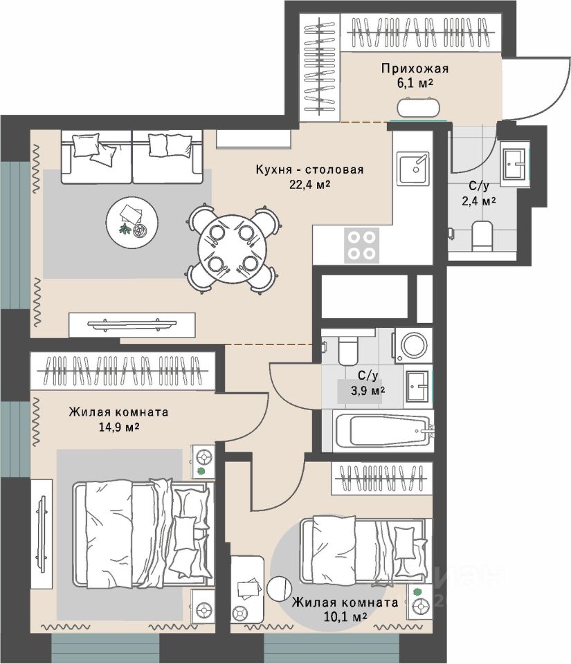 Продаётся 2-комнатная квартира в строящемся доме (Дом 2 этап 1.2), срок сдачи: I-кв. 2028, общей площадью 62.5 кв.м., на 14 этаже.