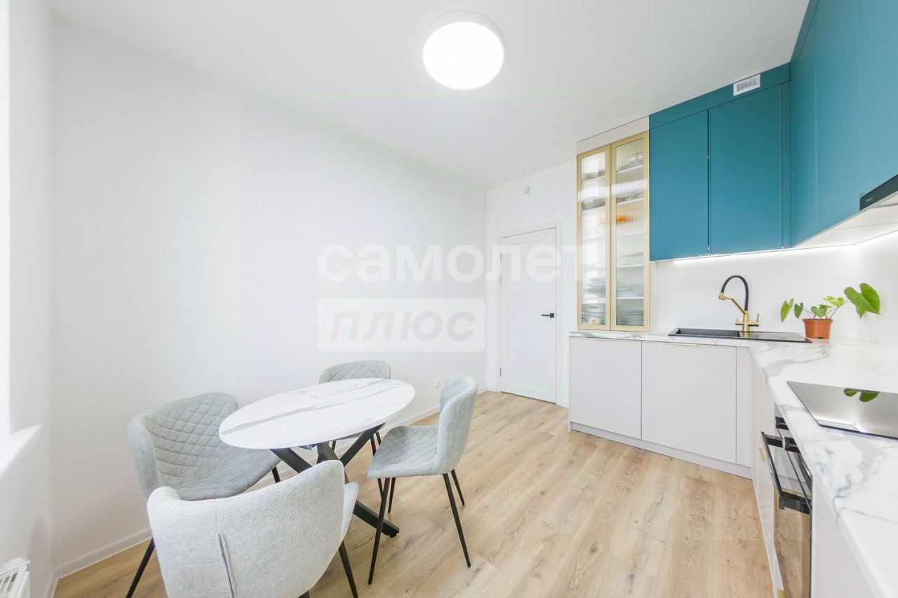 Кухня: гарнитур в потолок с доводчиками, дополнительной подсветкой, встроенной техникой (посудомойка, духовой шкаф, варочная панель, микроволновка, холодильник), встроенный 3-х ступенчатый фильтр, раздвижной стол на 4-8 персон, 4 мягких стула.