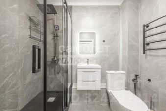 Ванная/санузел: отделка плиткой пол/стены, душевая кабина с тропическим душем, раковина и зеркало с подсветкой, напольный унитаз, гигиенический душ, подвесной шкафчик и вертикальная стиральная машина, также есть навесные крючки.