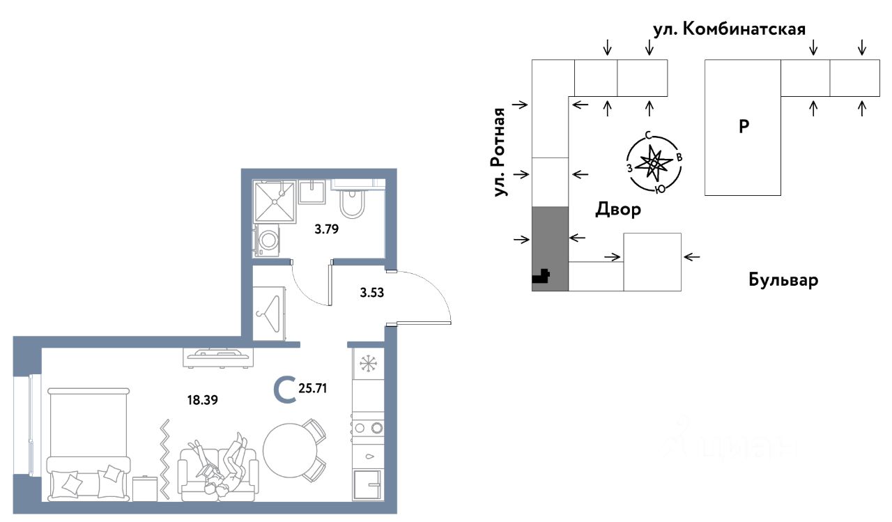 0комнатная квартира площадью 25,71кв. м. на 7 этаже жилого комплекса "Уральский сад".