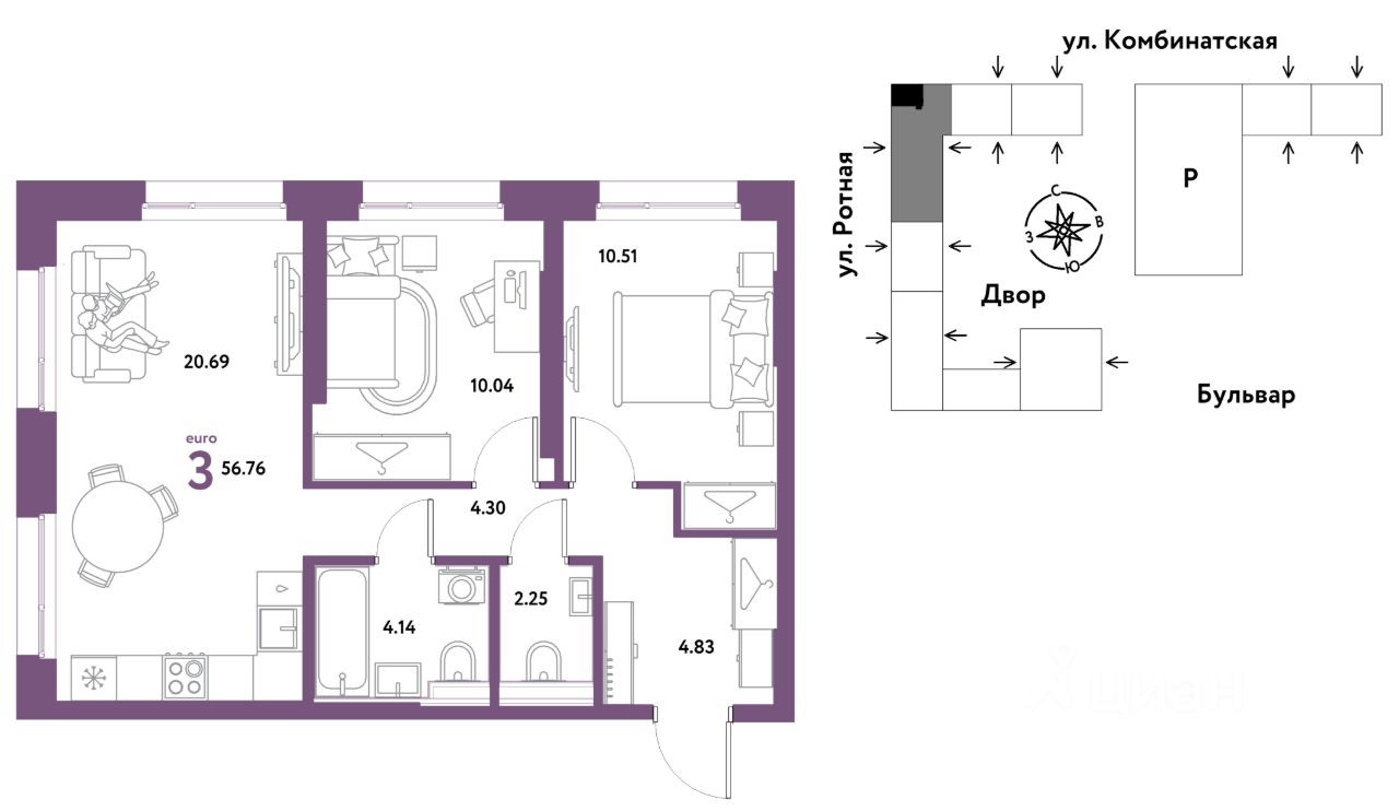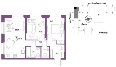 3комнатная квартира площадью 56,76кв. м. на 3 этаже жилого комплекса "Уральский сад".