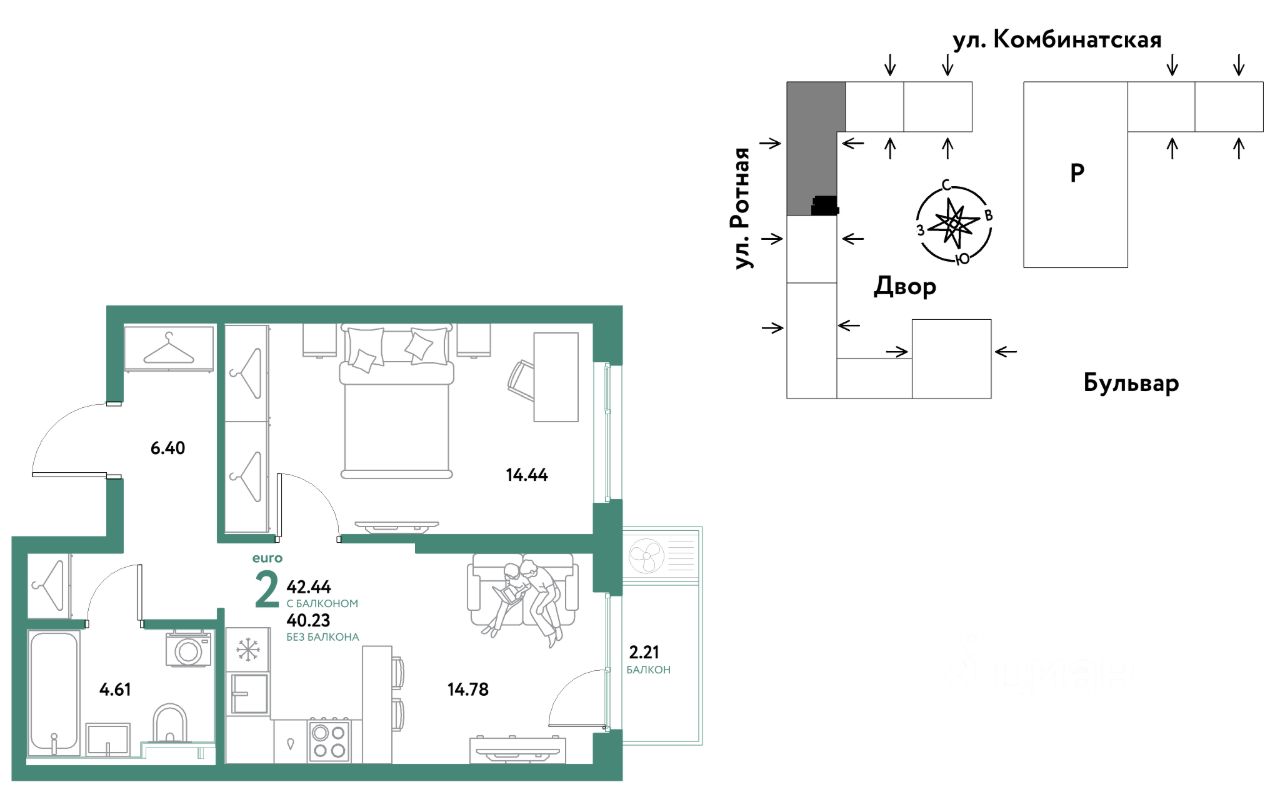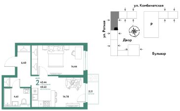2комнатная квартира площадью 42,44кв. м. на 5 этаже жилого комплекса "Уральский сад".