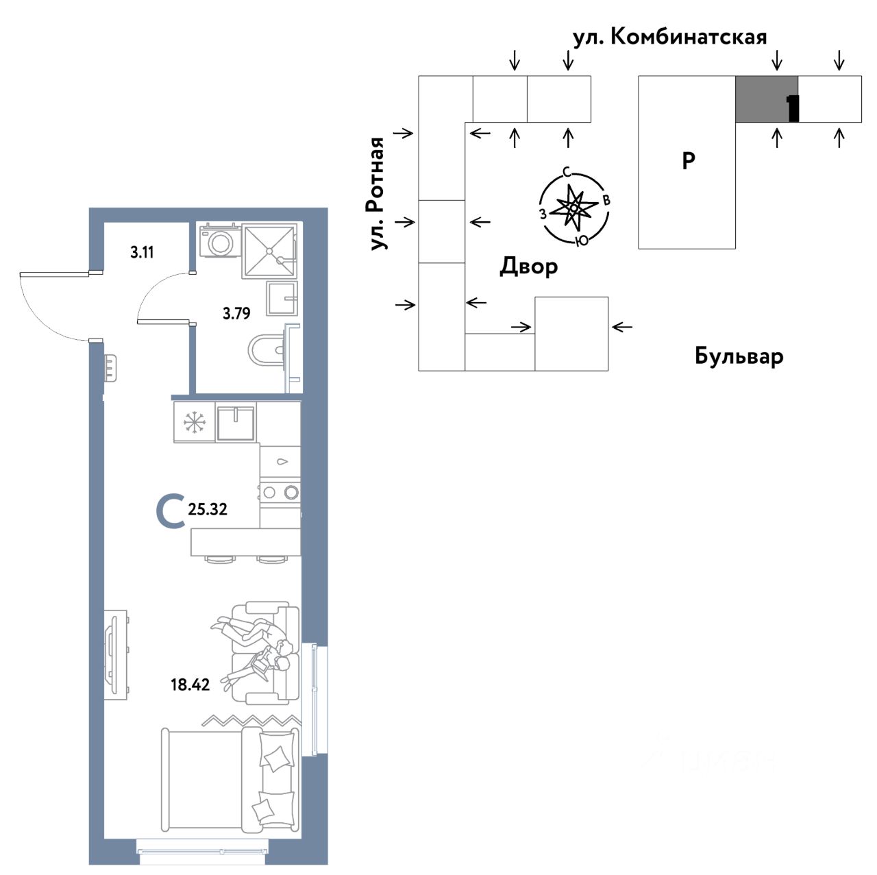 0комнатная квартира площадью 25,32кв. м. на 14 этаже жилого комплекса "Уральский сад".