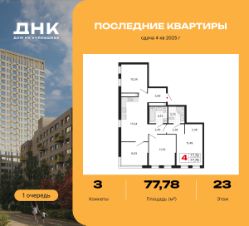 Продается трехкомнатная квартира с предчистовой отделкой в ЖК "ДНК. Дом на Куйбышева" на 23 этаже. Общая площадь: 77.78 кв.м., жилая: 33.35 кв.м., площадь просторной кухни-столовой: 17.04 кв.м. Квартира угловая, идеально подойдет любителям тишины и панорамных видов. В квартире два совмещенных санузла. Высота потолков 2.7 м.