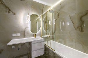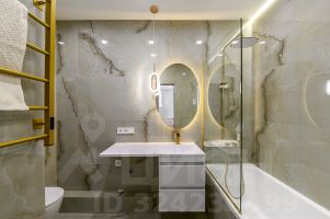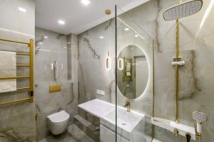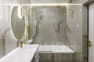 В ванной комнате — широкоформатная плитка, создающая эффект простора и элегантности.