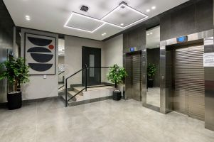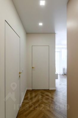 На полу — дорогой кварцвинил, который сочетает в себе стиль и практичность. Он не только выглядит роскошно, но и устойчив к износу.