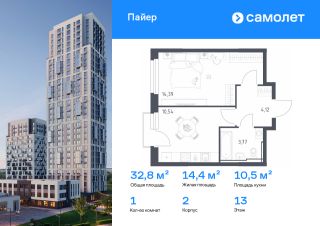 Строим кварталы для жизни с заботой о будущем. Предлагается 1-комнатная квартира комфорт-класса 32,82 кв.м в корпусе 2 на 13 этаже, в ЖК "Пайер"