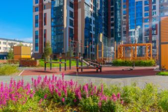 Особенно хочется отметить зоны для детей: обустроенные детские площадки из натуральной лиственницы, покрытые настоящей морской галькой, спортивные корты для летних игр и workout-зоны, дорожки со специальным покрытием, и многое другое, где можно на свежем воздухе в любое время года жить и растить своих детей.