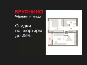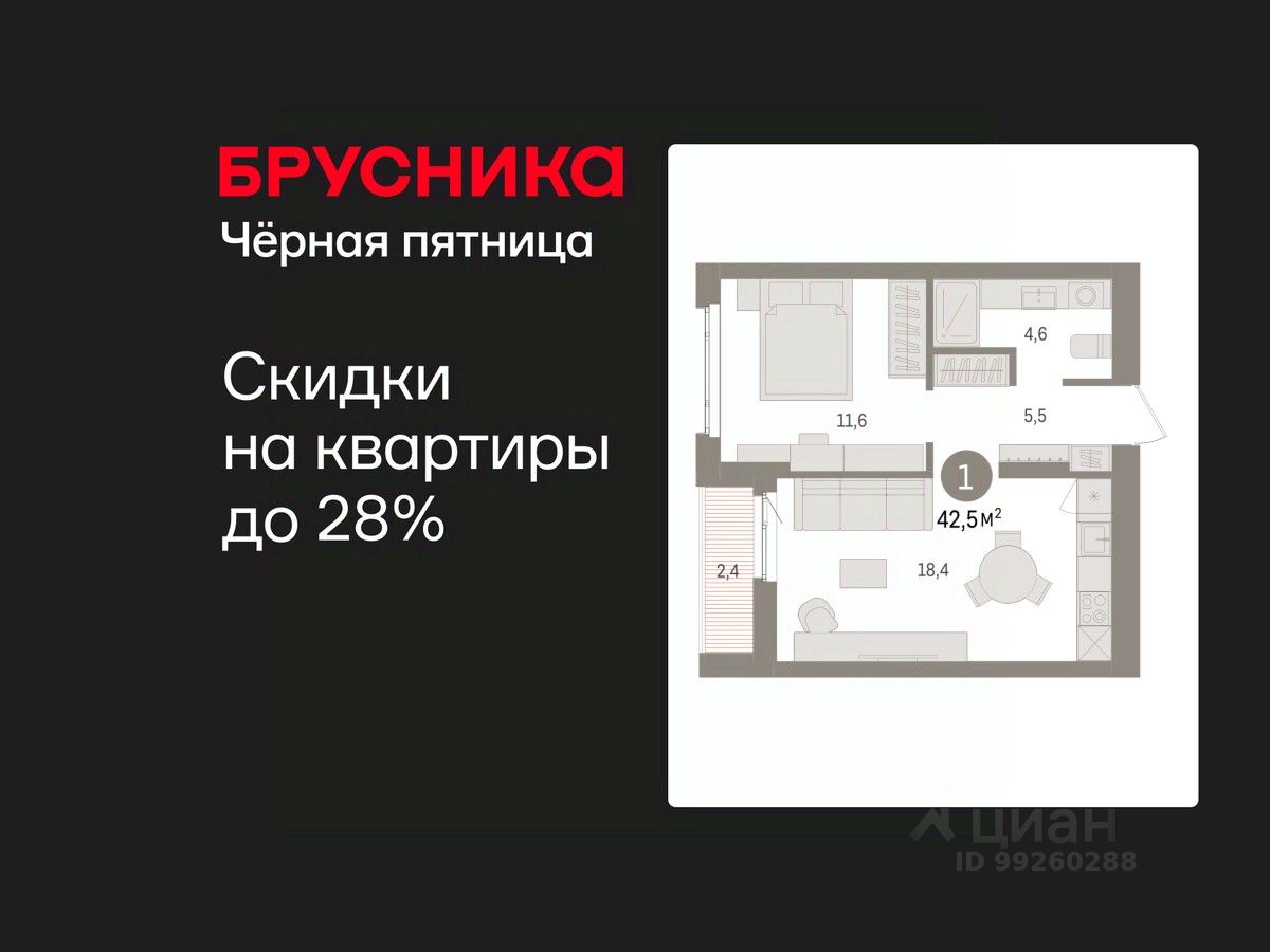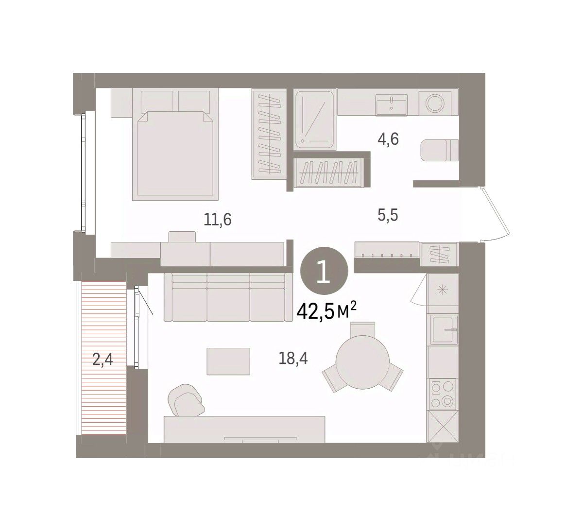 1-комн. квартира от застройщика с предчистовой отделкой в ЖК "Квартал Траектория" на 5 этаже. Общая площадь: 42.5 кв.м., жилая: 11.3 кв.м., площадь просторной кухни-столовой: 17.6 кв.м. Все окна выходят на одну сторону. В квартире одна лоджия, один совмещенный санузел. Высота потолков 2.82 м.