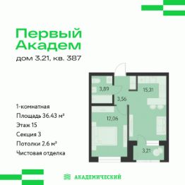 Продается 1-комнатная квартира площадью 36.43 кв.м. от девелопера "Академический" в жилом квартале "Первый Академ". Срок сдачи дома в 2028 году. Выгоды и скидка напрямую от застройщика. Дом расположен на въезде в район, отличается удобной транспортной развязкой. Рядом новая трамвайная линия и остановка общественного транспорта. Пять домов разной этажности. Эко-тренды во дворах. Холлы и фасады в стиле ар-деко. На территории квартала предусмотрено множество удобств для жильцов, включая видеонаблюдение 24/7, двор без машин, кладовые и подземный паркинг с выходом из лифта, коммерция на первых этажах.
