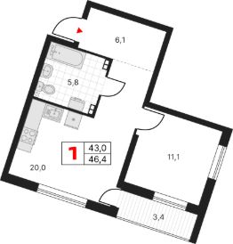 Продаётся 1-комнатная квартира в строящемся доме (Дом 1.1), срок сдачи: IV-кв. 2026, общей площадью 46.42 кв.м., на 7 этаже.