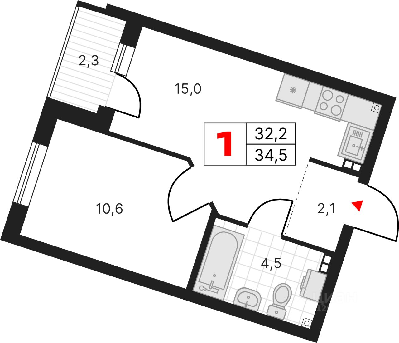 Продаётся 1-комнатная квартира в строящемся доме (Дом 1.1), срок сдачи: IV-кв. 2026, общей площадью 34.5 кв.м., на 13 этаже.