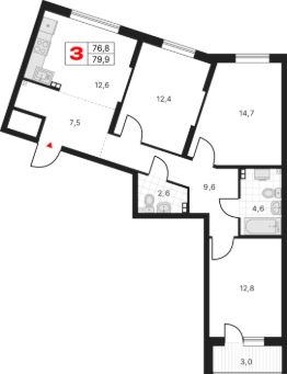 Продаётся 3-комнатная квартира в строящемся доме (Дом 1.1), срок сдачи: IV-кв. 2026, общей площадью 79.89 кв.м., на 15 этаже.