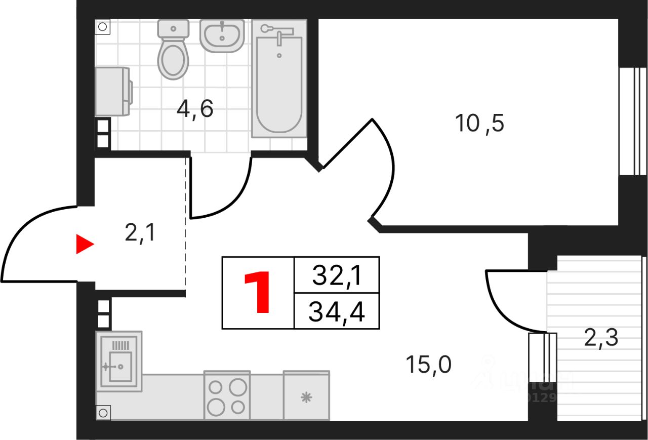 Продаётся 1-комнатная квартира в строящемся доме (Дом 1.1), срок сдачи: IV-кв. 2026, общей площадью 34.4 кв.м., на 4 этаже.